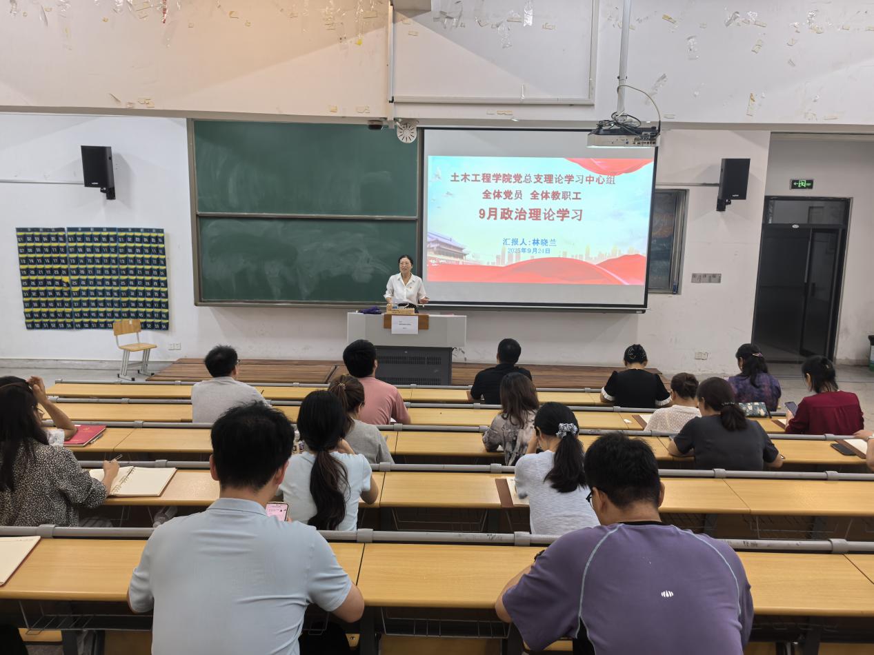 9月24日,土木工程学院召开9月份全体教职工政治理论学习会。学院党总支书记林晓兰领学了《习近平总书记关于建设教育强国的重要论述》《中国共产党章程》以及《国防教育》等学习内容。