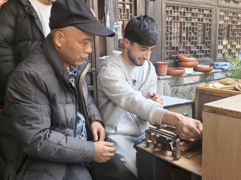 “梳为龙凤,篦作鸳鸯;梳顺发,篦除垢,更‘梳’心。”常州梳篦第九代传人邢粮向留学生介绍了常州梳篦的发展历史。体验区里,非遗大师手把手示范最考验耐性的“开齿”:左手握篦坯,右手推拉钢丝锯,一齿失误,全篦报废。留学生们轮流上阵,留学生MANSUR在导师的指导下,慢慢开始自己操作,相当兴奋。在彩绘工坊,留学生们拿起极细狼毫,为素篦点上牡丹图案。两小时后,一把把亲手制作的彩绘梳篦陆续完工。“我要把它寄给妈妈,告诉她我在中国学会了‘梳’心!”留学生AMIRKHAN现场和妈妈发视频。留学生YSMAIYLOVICH在整个体验活动中都进行了拍摄,说想带回去给朋友看。
